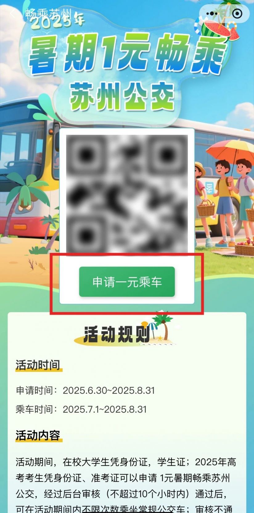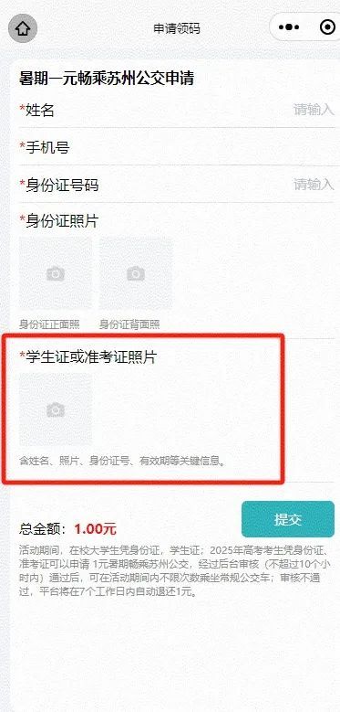 活动期间,在校大学生凭身份证,学生证;2025年高考考生凭身份证、准考证可以申请 1元暑期畅乘苏州公交,经过后台审核(不超过10个小时内)通过后,可在活动期间内不限次数乘坐常规公交车;审核不通过,平台将在7个工作日内自动退还1元。